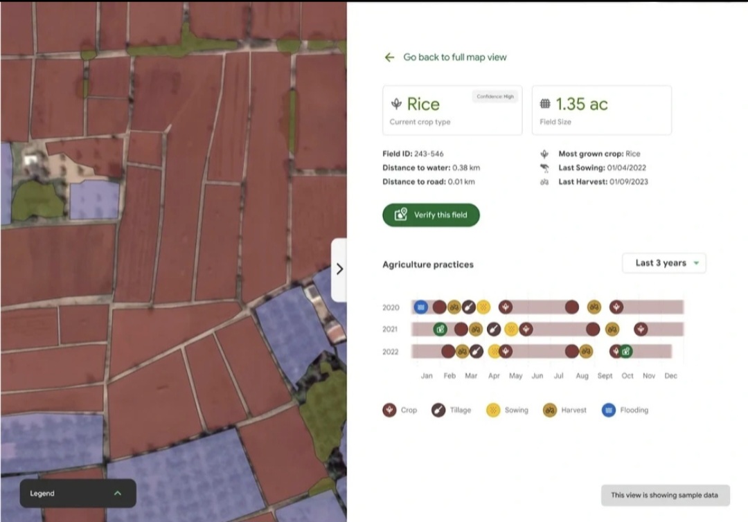 "Mỗi thửa ruộng được cấp một ID duy nhất, chúng tôi cũng có thể cho bạn biết diện tích của nó... API này có dữ liệu lịch sử 15 năm, cho phép bạn thấy việc sử dụng đất đã thay đổi như thế nào. Đồng thời, nó có thể cho bạn biết loại cây trồng có khả năng cao nhất là gì", ông Alok Talekar giải thích.